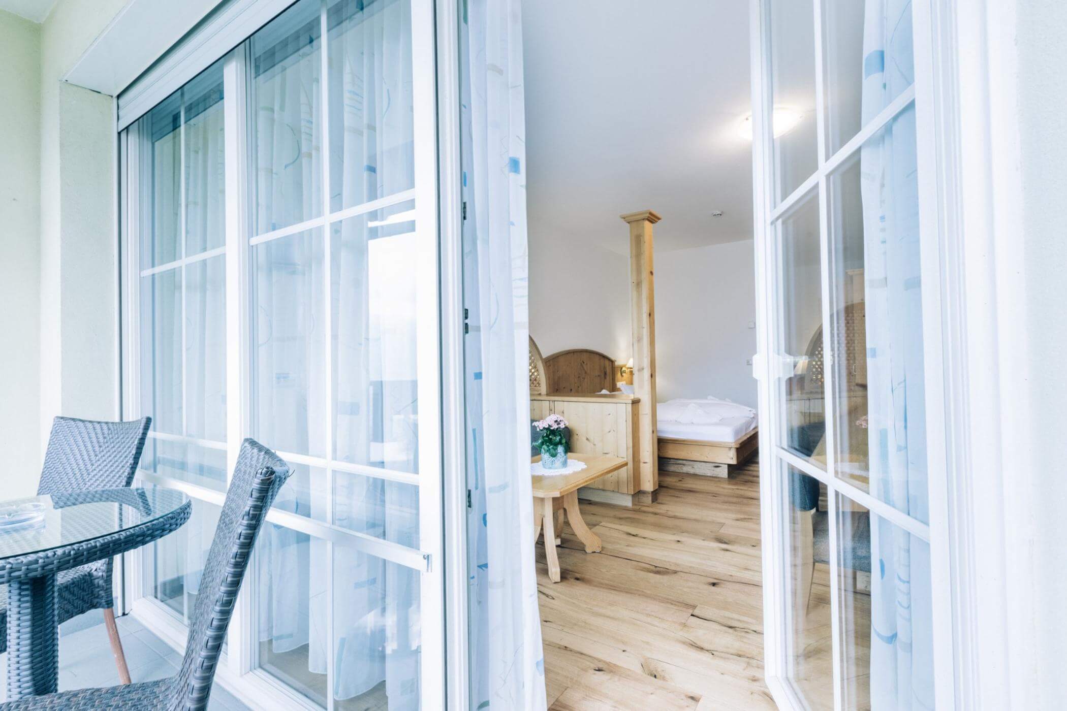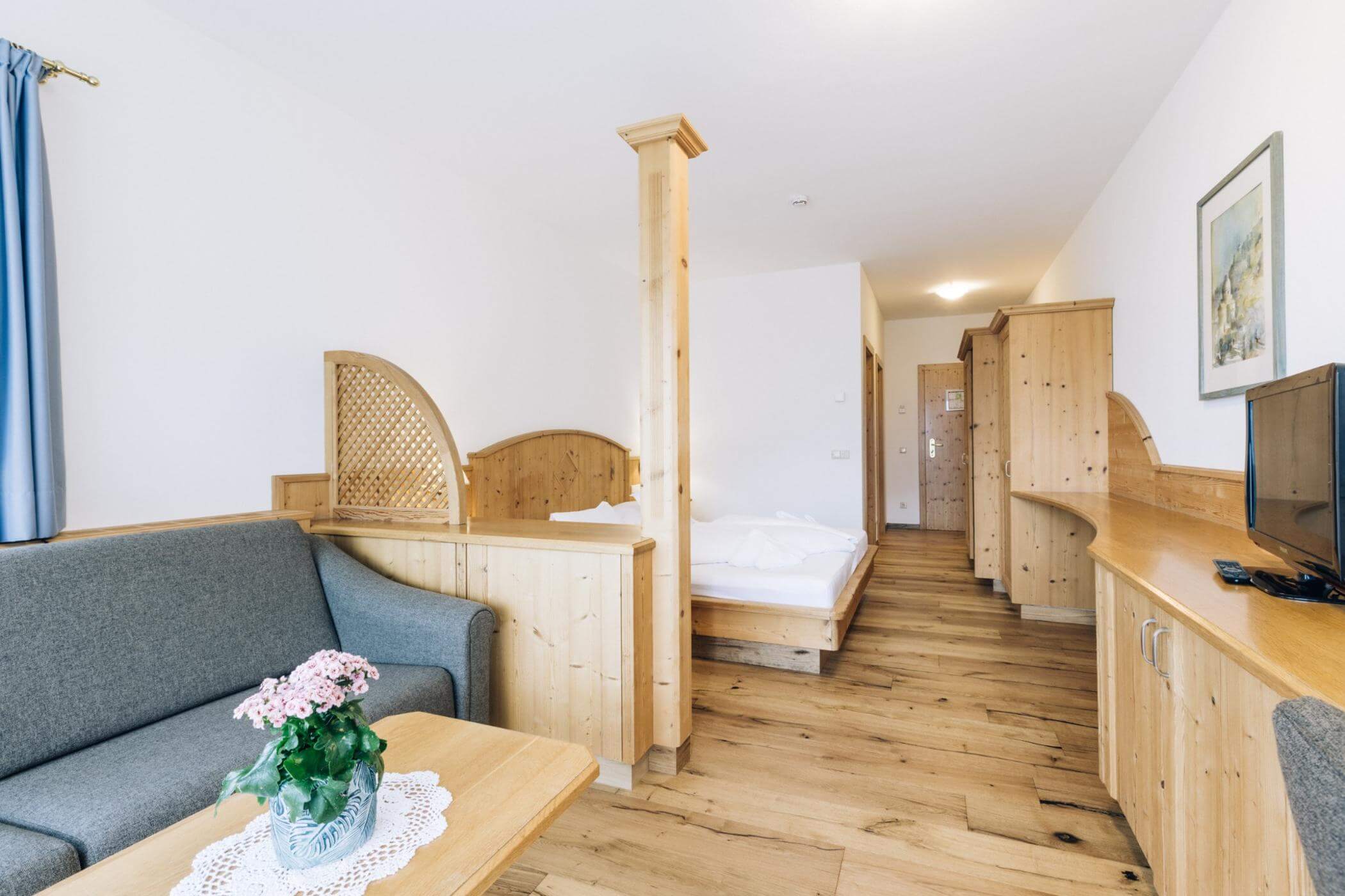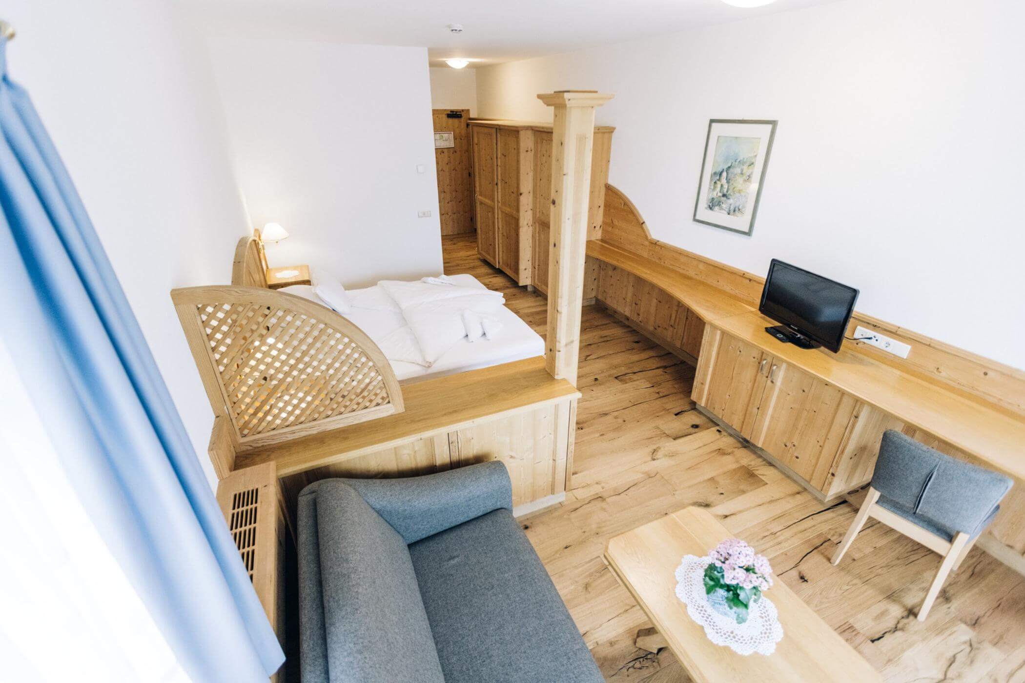 Un accogliente rifugio con vista panoramica: la Camera matrim. Chiusa di Salorno, al 1° piano, colpisce per i suoi elementi in legno massiccio su misura e il pavimento elegante in rovere. Un divisorio separa la zona notte dal soggiorno, che si apre direttamente sul balcone. Da qui è possibile ammirare la splendida vista sulla Val d’Adige, fino alla Chiusa di Salorno, porta d’accesso al Trentino.