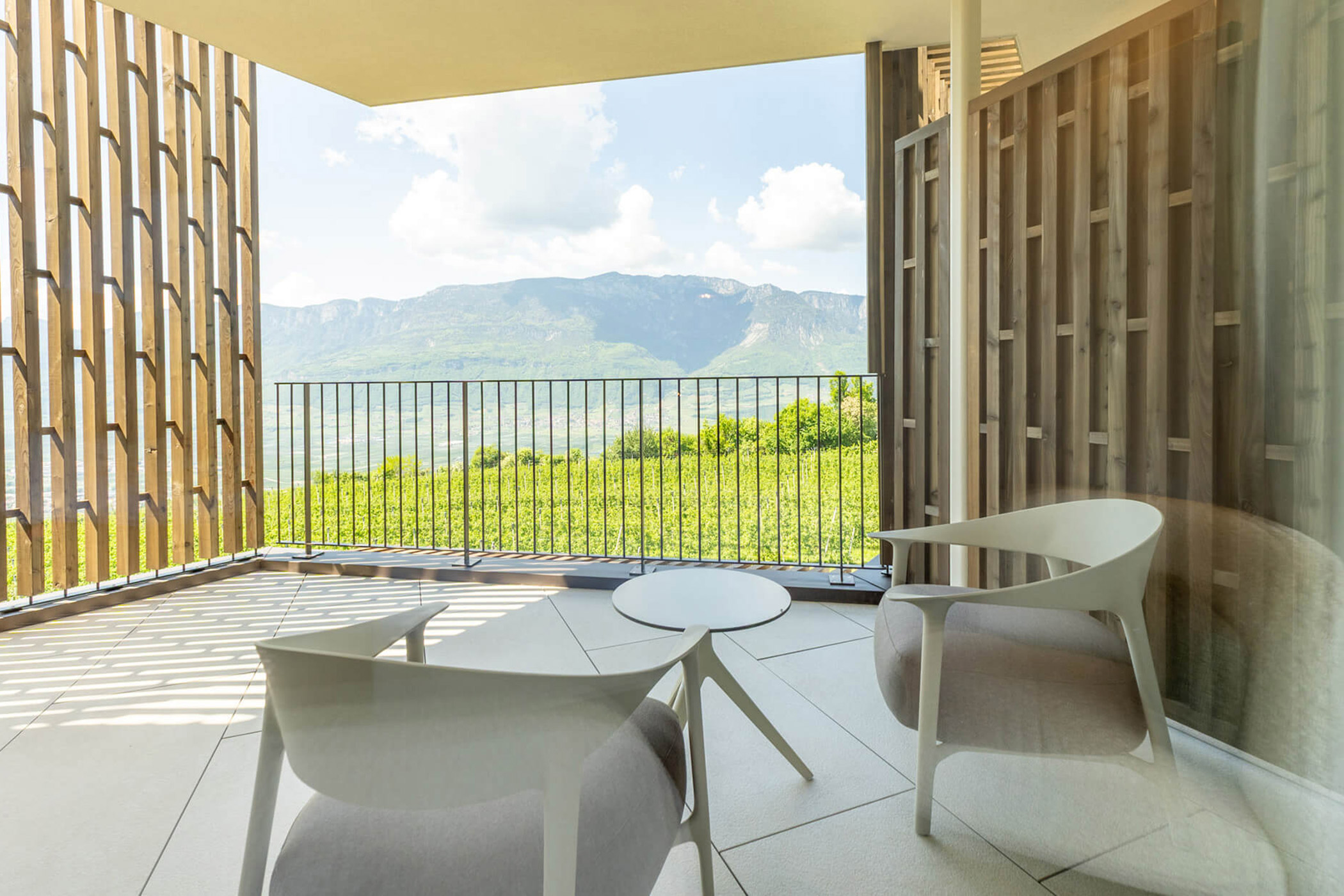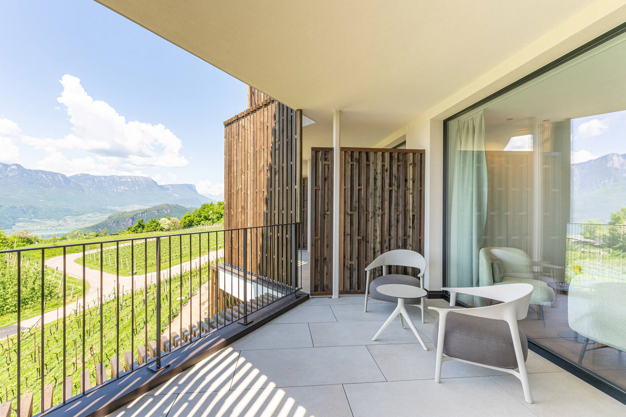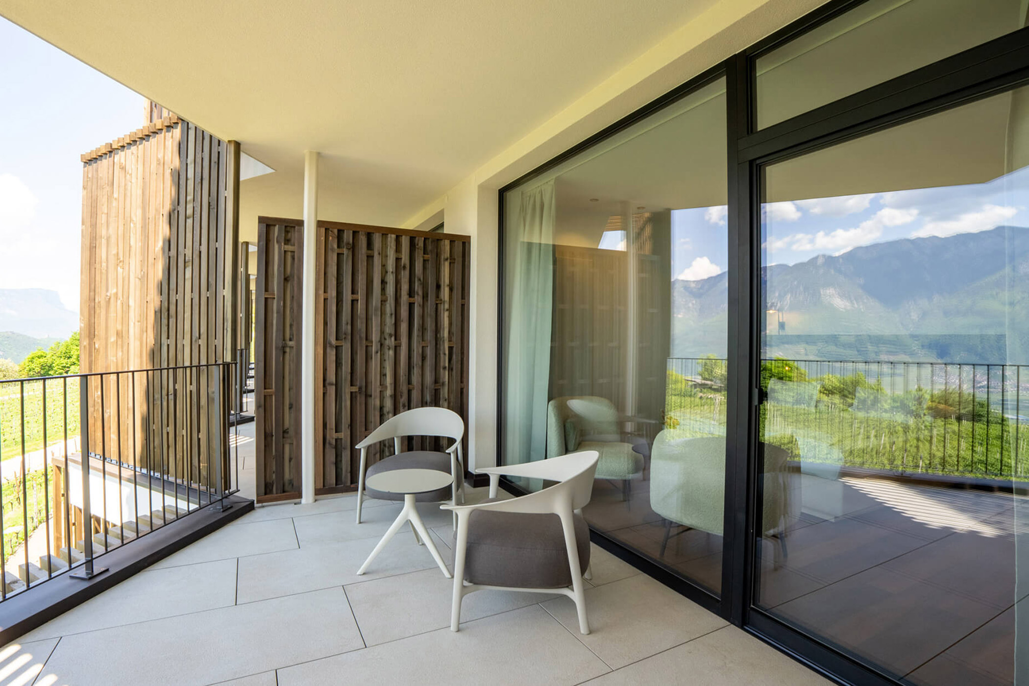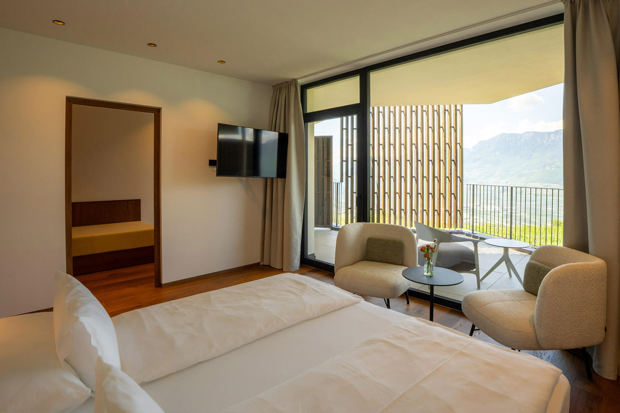 Nuova, moderna e versatile: la Suite Montagna 313, al 3° piano, offre ampi spazi e comfort per coppie o famiglie. Oltre alla camera da letto principale, è presente un secondo ambiente separato, utilizzabile come soggiorno, seconda camera o stanza per bambini. Il balcone di 12 m² regala una vista incantevole sui vigneti, la Val d’Adige e il Lago di Caldaro.