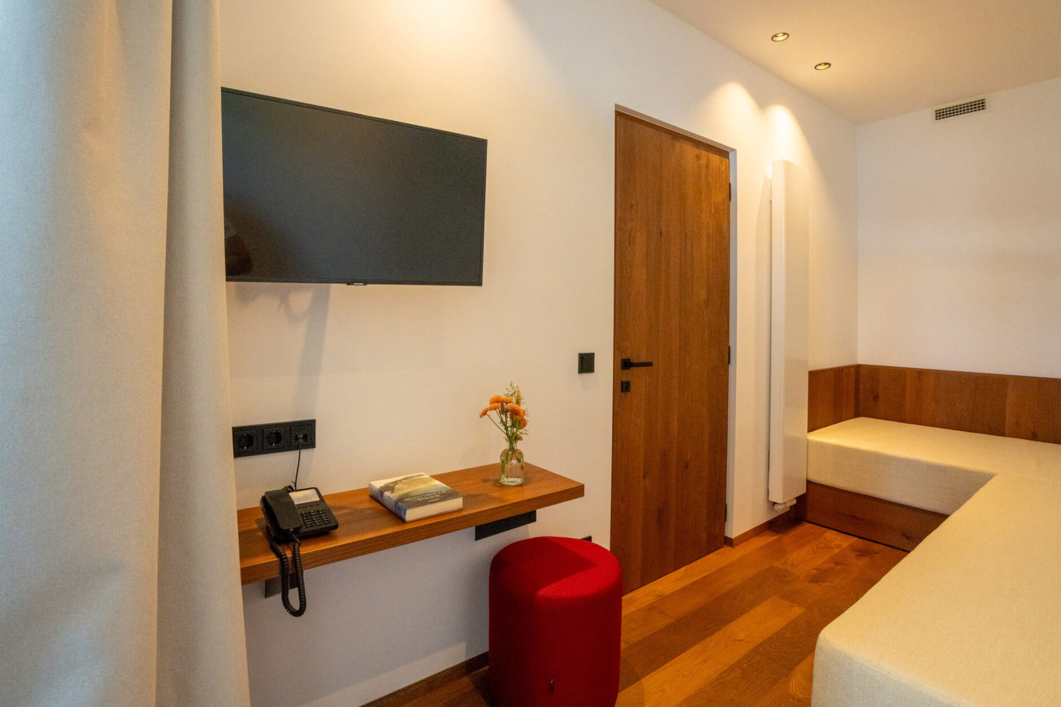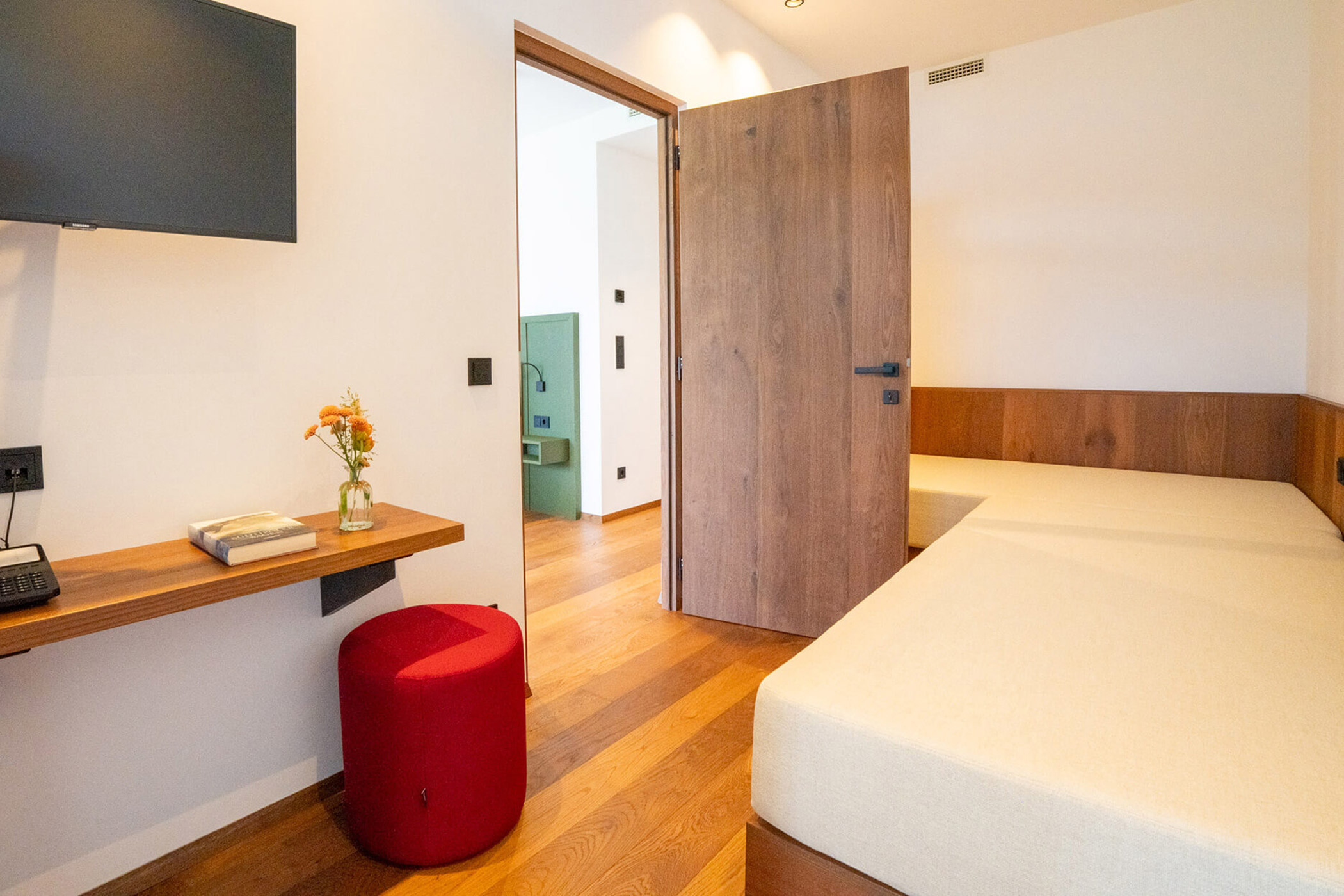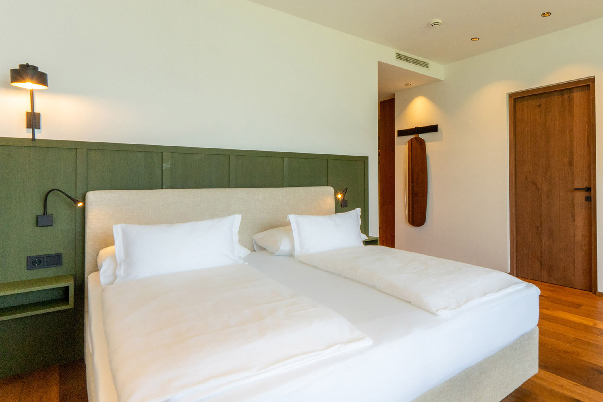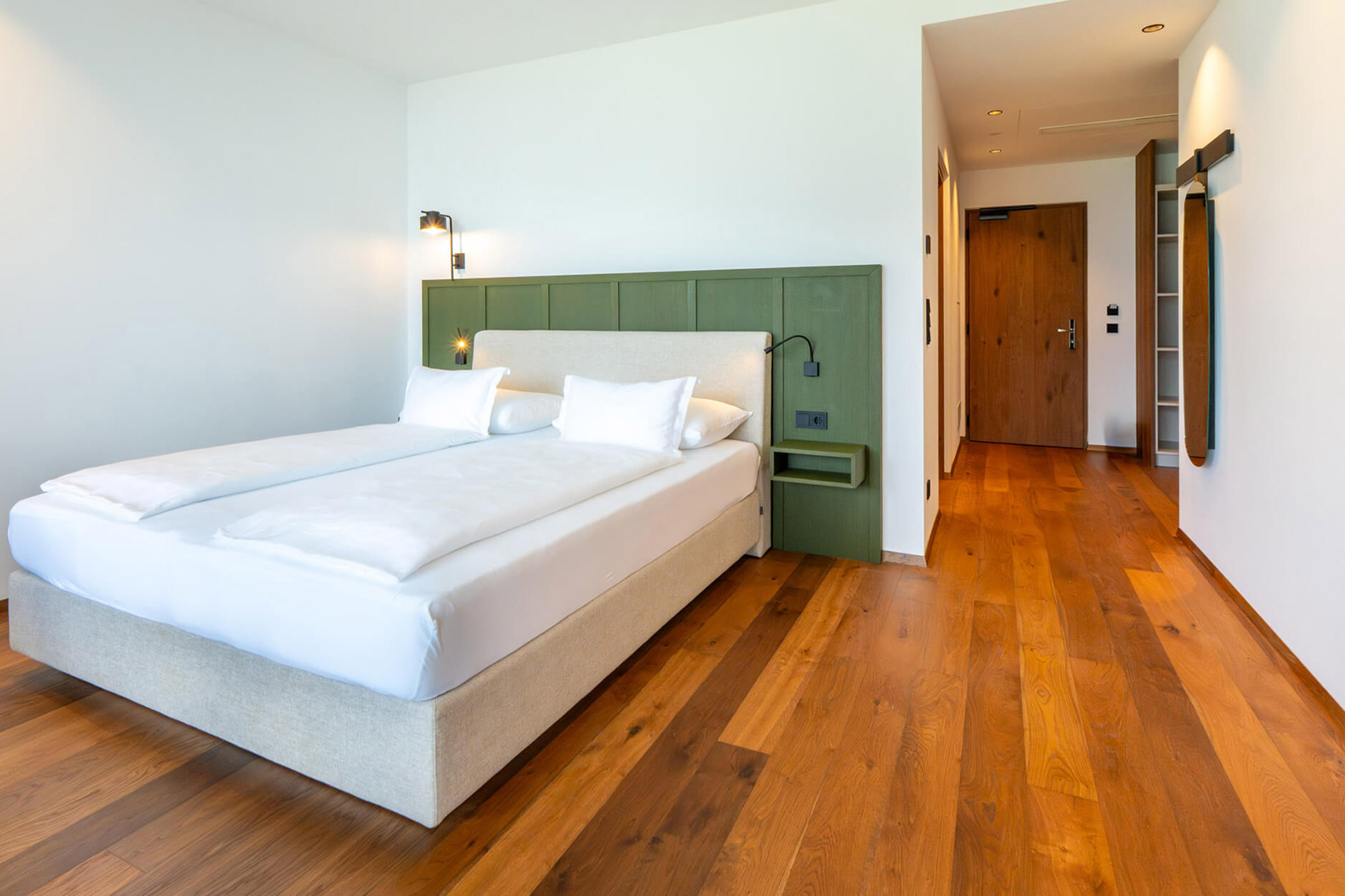 Nuova, moderna e versatile: la Suite Montagna 313, al 3° piano, offre ampi spazi e comfort per coppie o famiglie. Oltre alla camera da letto principale, è presente un secondo ambiente separato, utilizzabile come soggiorno, seconda camera o stanza per bambini. Il balcone di 12 m² regala una vista incantevole sui vigneti, la Val d’Adige e il Lago di Caldaro.
