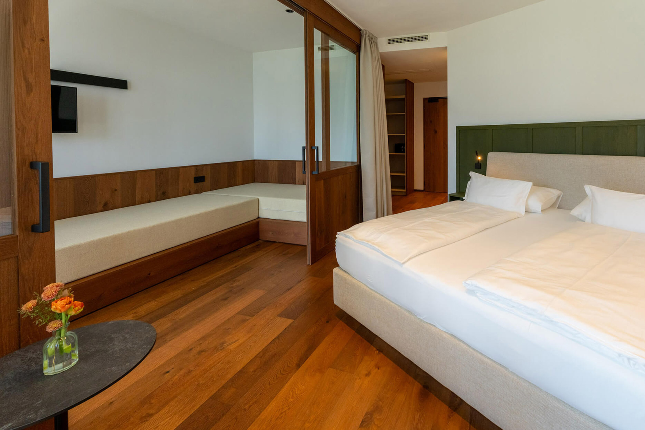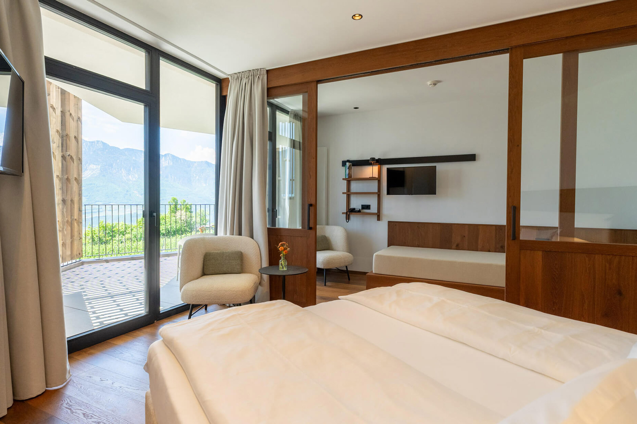 La Suite Vigneto 212, situata al 2° piano, offre ampi spazi abitativi per coppie e famiglie. Oltre alla camera da letto principale, la zona giorno può essere trasformata in una seconda camera da letto, perfetta per famiglie con fino a tre bambini. Il balcone di 12 m² regala una vista incantevole sui vigneti, la Val d’Adige e il Lago di Caldaro.